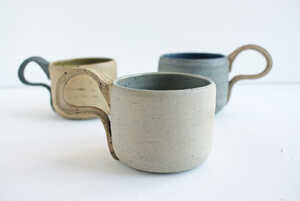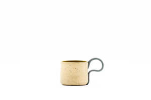 These handmade coffee mugs hold 150 ml of your favourite coffee. They measure 7 cm wide and 6.3 cm high. The roomy handles, made in a complementary colour, give the cup its depth at 11.6 cm. The handle is 4.6 cm and perfect for any hand. They are a lovely cup to hold, whether using the handle or just nestled in your hand. This hand-crafted pottery has a refined, tactile surface reminiscent of a sandy stone beach. The fine rim makes drinking from this cup a pleasure.