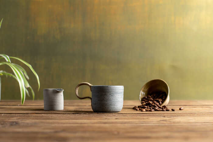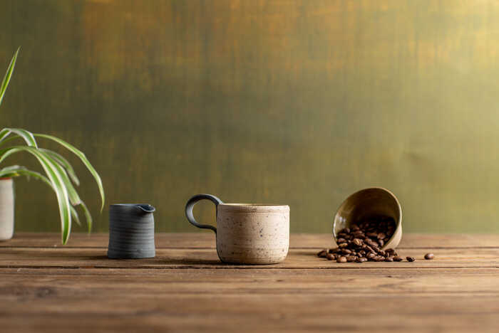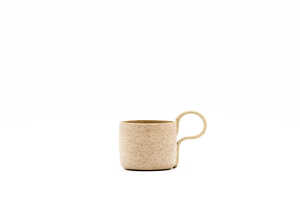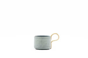 The Dark Grey Blue has an immersive blue interior and deep grey exterior. The internal and external surfaces are dotted with flecks of light and dark, and the contrasting handle cuts a pale streak across the cup, a flash of brightness in the night. The cool and gentle tones of the Pale Blue-Grey reflect how Spring moves us from pale Winter to gentle Spring days. The soothing grey exterior carries the first hints of blue sky; inside, the colour is intensified by the glaze and speckled with bursts of rich blue. The soft, neutral shades of the handle complement the overall placidity of the cup. The interior of the Sandy Beige colour is reminiscent of pale, dipping willow leaves. The handle, a soothing grey, arcs across the exterior like a river around the light sand of a slow bend. Finally, the Earth Brown reflects the colours of a rocky path; the interior glaze lights the darker exterior and highlights the speckled surface of the earth.