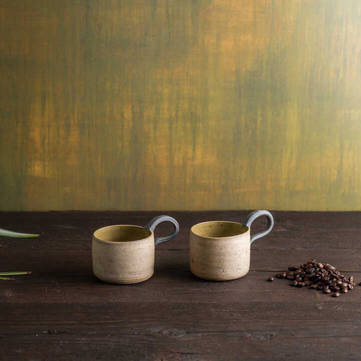A Set of Two 150 ml Hand-thrown Ceramic Stoneware Coffee Cup in Dark Grey-Blue, Pale Blue-Grey, Sandy Beige and Earth Brown