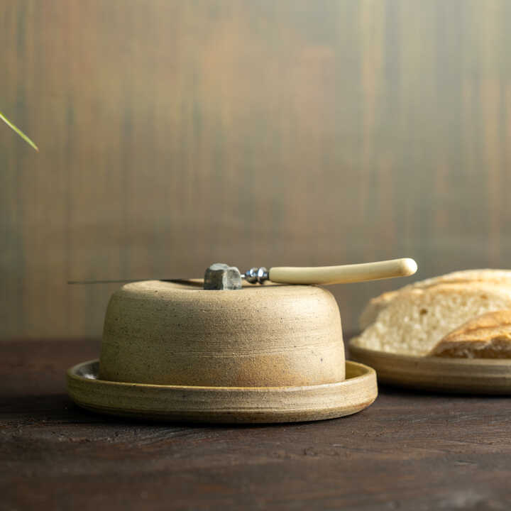 Hand-Thrown Ceramic Stoneware Butter Dish in Dark Grey-Blue, Pale Blue-Grey and Sandy Beige