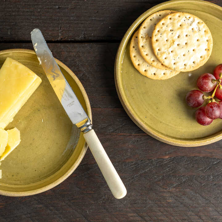 Japandi-Style Hand-Thrown Ceramic Stoneware Set of Two Tea Plates in Dark Grey-Blue, Pale Blue-Grey and Sandy Beige